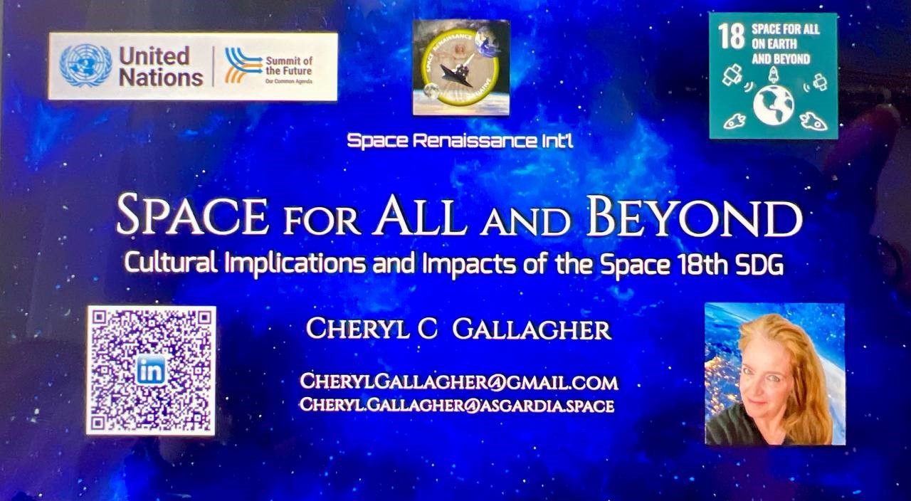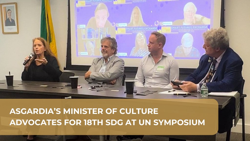 El 19 de septiembre de 2024 la ministra de Cultura de Asgardia, Cheryl Gallagher, hizo una presentación en apoyo de la elaboración de un Objetivo de Desarrollo Sostenible (ODS) 18 dedicado al espacio en un simposio celebrado en la Plaza de las Naciones Unidas de Nueva York. El acto organizado por Space Renaissance International y la Sociedad Nacional del Espacio, junto con otras organizaciones especializadas en el espacio, hizo un llamamiento a los Estados parte de la Comisión de las Naciones Unidas sobre la Utilización del Espacio Ultraterrestre con Fines Pacíficos (COPUOS) para que redacten una resolución sobre un ODS 18 relativo al espacio antes de la Cumbre del Futuro y de la 79ª Asamblea General de las Naciones Unidas (AG 79 de la ONU). -