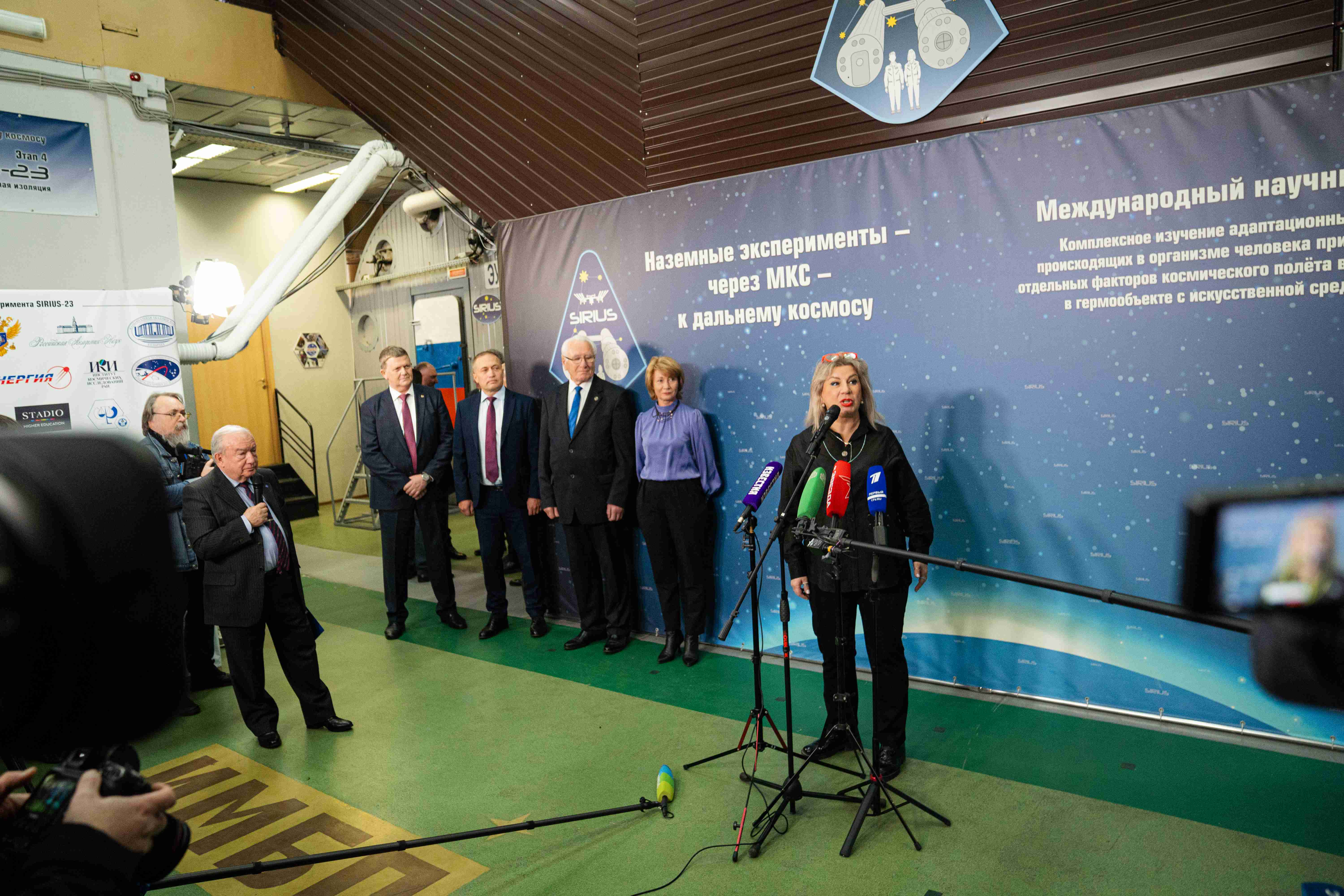 En la sesión informativa dedicada a la salida del aislamiento, a los voluntarios les dieron la bienvenida altos representantes de la industria, entre ellos Oleg Orlov, Director del Instituto de Problemas Biomédicos, Académico de la ACR, Maxim Jarlámov, Jefe del Centro de Entrenamiento de Cosmonautas Gagarin, Lena De Winne, Primera Ministra de la Nación Espacial de Asgardia, y otros.